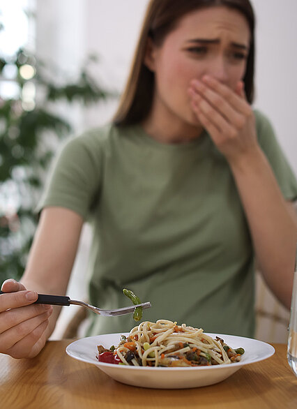 Häufig sind: ein flaues Gefühl im Magen, begleitet von Brechreiz, Erbrechen, Appetitlosigkeit, Schwindel, Kreislaufproblemen, aber auch Heißhungerattacken
